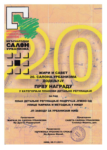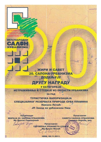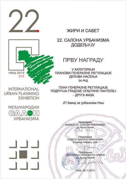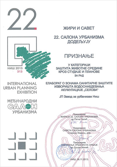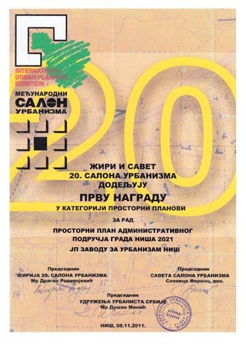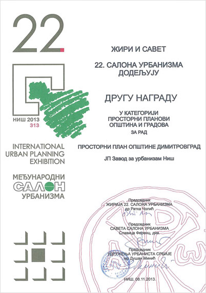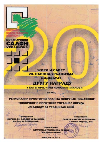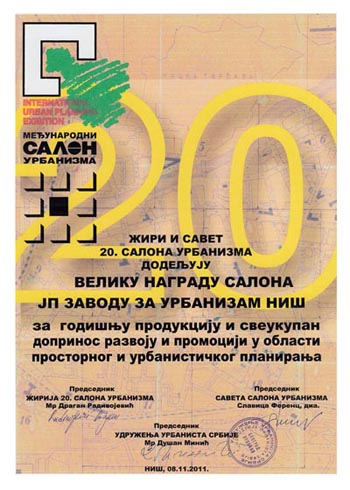 Велика награда Салона припала је ЈП Заводу за урбанизам Војводине, док су нашој кући припале две награде за ПП Општине Димитровград (II награда у категорији Просторних планова) и ПГР II фаза општине Пантелеј (I награда у категорији Планова генералне регулације). Завод је добио и признање за Елаборат о зонама санитарне заштите изворишта водоснабдевања акумулације "Селова".